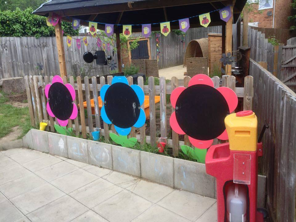 Chalkboards, painting easels, floors and fences provide opportunities for children to express their thoughts and ideas by creating lines, circles and pictures.