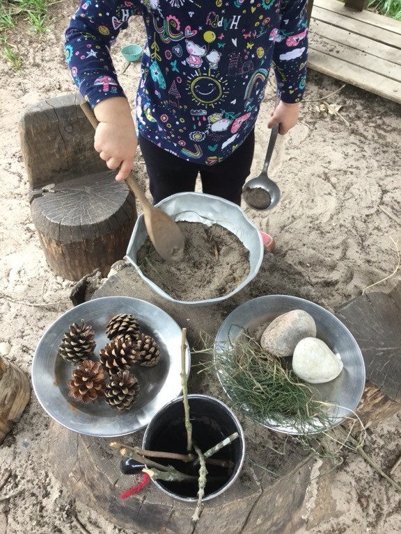 The mud kitchen, mixing soil and water to create pies/ imaginary food to develop their make believe stories.