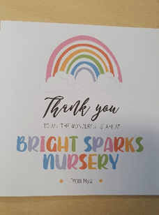 “Bright Sparks Nursery has been amazing for my child, when he first came he struggled leaving us at drop off, staff were amazing at helping him on a one – to – one basis. The children’s needs are always met, communication from staff to parents is amazing and staff are so friendly and caring. I could not thank the staff enough for helping with his development and how well they interact with children”