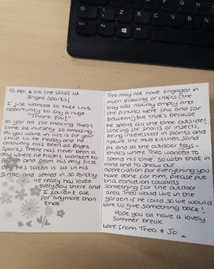 “Arthur has had the best time at Bright Sparks. He started off really shy not wanting to leave us and now he is really confident and bubbly and that’s all down to the care and compassion of the staff. we have sent all 3 of our children here and they all had the best time and made so many memories. The staff make it very easy to talk to them about worries or concerns. Arthur loved the outside space looking for bugs, growing vegetables, playing in the mud kitchen, painting, water tray and much more. There always a range of activities. this nursery is the best by far”