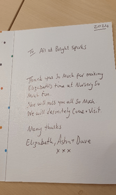 “Bright Sparks has been a home from home for my daughter. From starting aged two up until school, the whole team have been utterly amazing. They have supported Lola with her emotional and social wellbeing fantastically. Without Bright Sparks I don’t think shed be as confident as she is. Megan her key worker is incredible and I wish my older 3 had gone to Bright Sparks it is such a wonderful place”